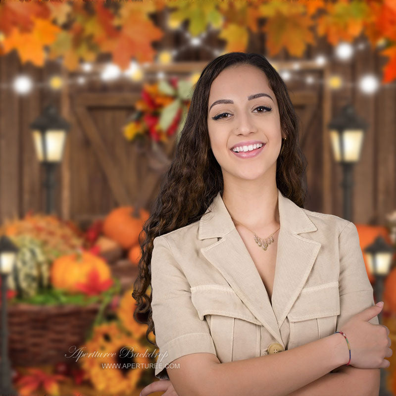 Rote Ahornbäume Kürbisse Holztür Herbsthintergrund für die Dekoration